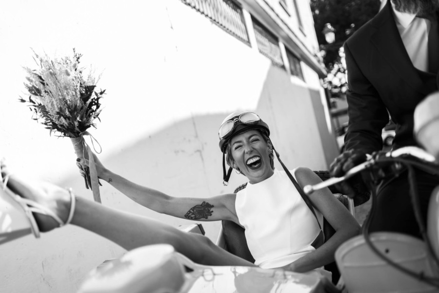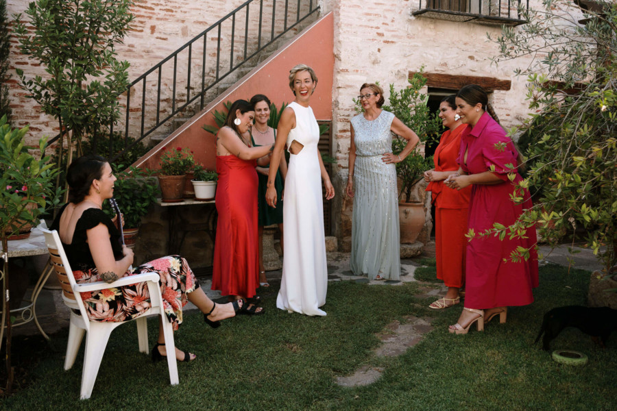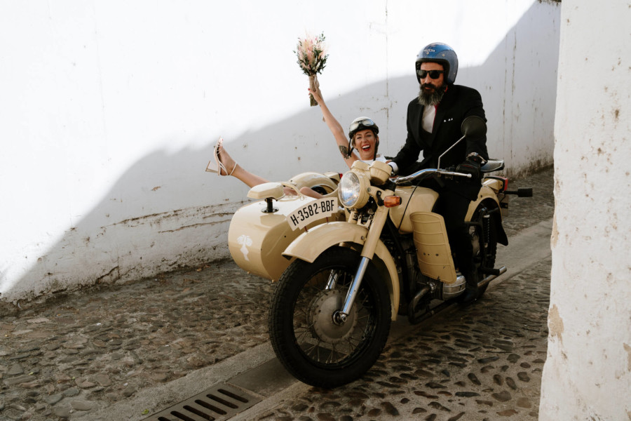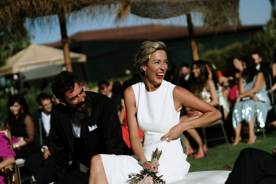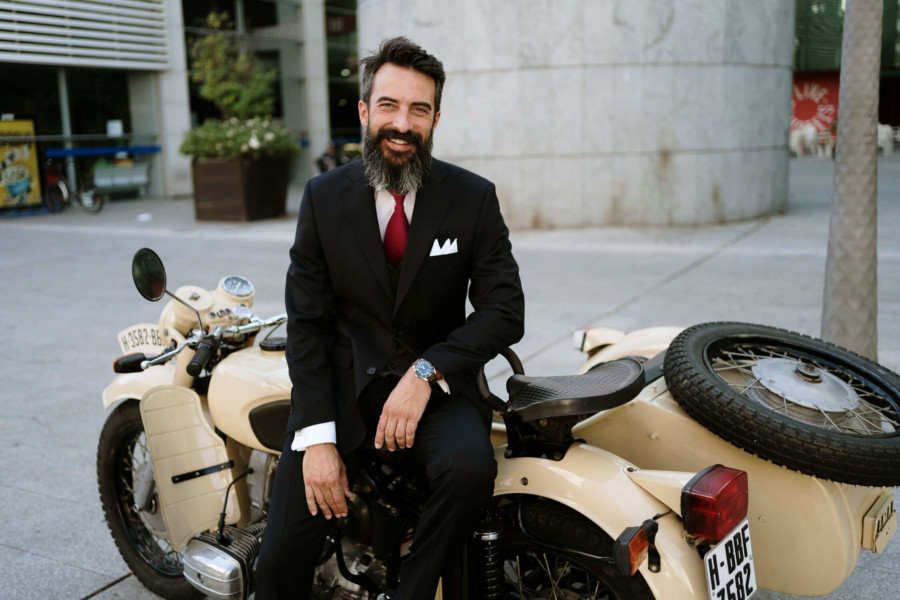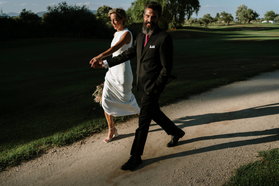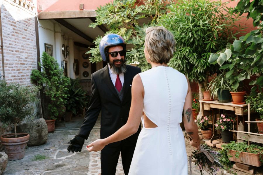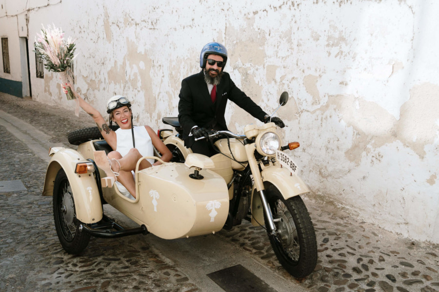 Perros, ukelele, moto clásica con sidecar… Todo tremendo. El calor que hacía en Talavera era asfixiante, pero no deslució el bodón que Susana y Diego nos tenían preparado. Ella se vistió acompañada de su familia y amigas en la casa familiar. Diego lo hizo acompañado de sus padres, su hermana y su cuñado. A casa de Susana llegó Diego a los lomos de una BMW clásica para llevarla en sidecar casi hasta el altar. Los retratos los hicimos en un campo de golf, cuando el fuerte sol nos daba descanso. La cena de cóctel se celebró en Palomarejos Golf. Y fiestón hasta la madrugada. Susana llevaba un sencillo vestido cut-out, sandalias blancas y un ramo en tonos beige y rosa. Diego lucía un traje negro con chaleco gris marengo y corbata burdeos.