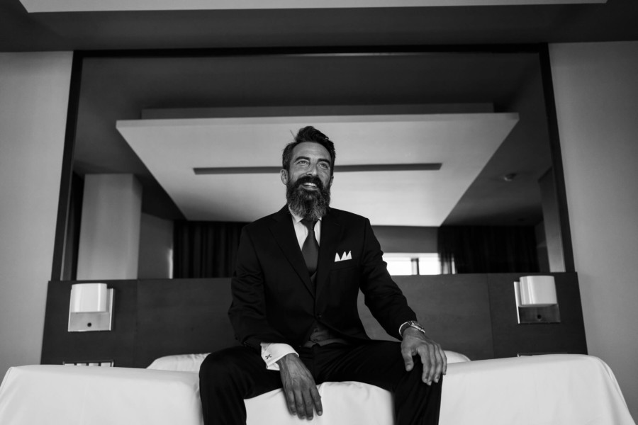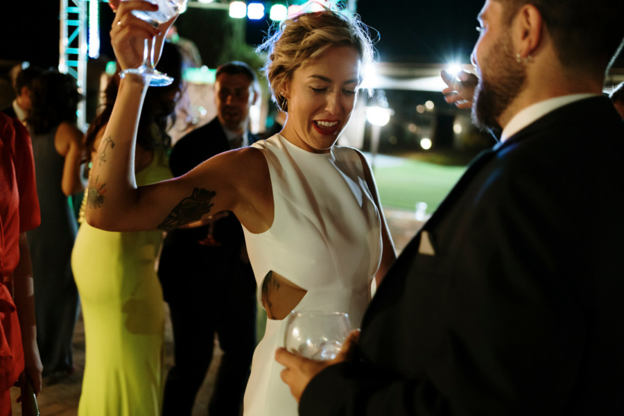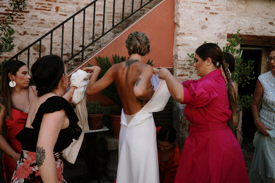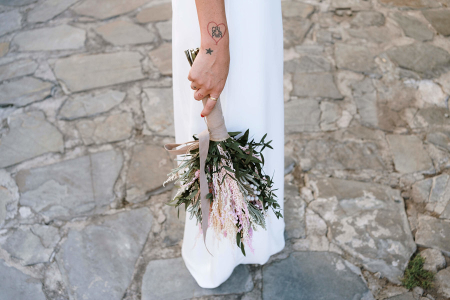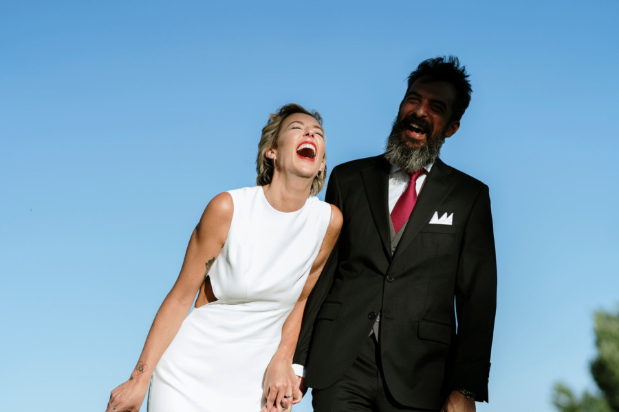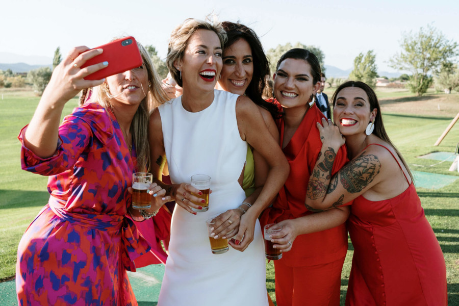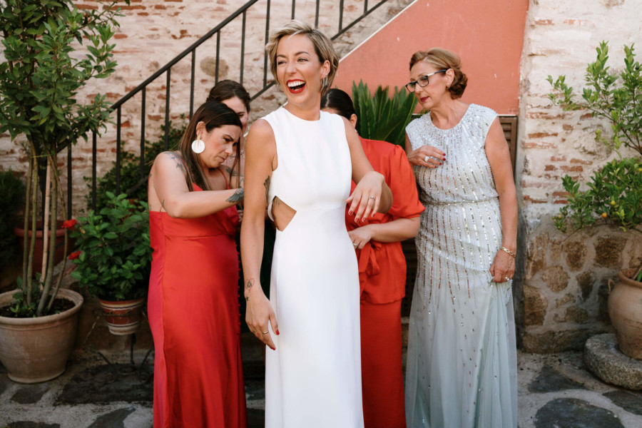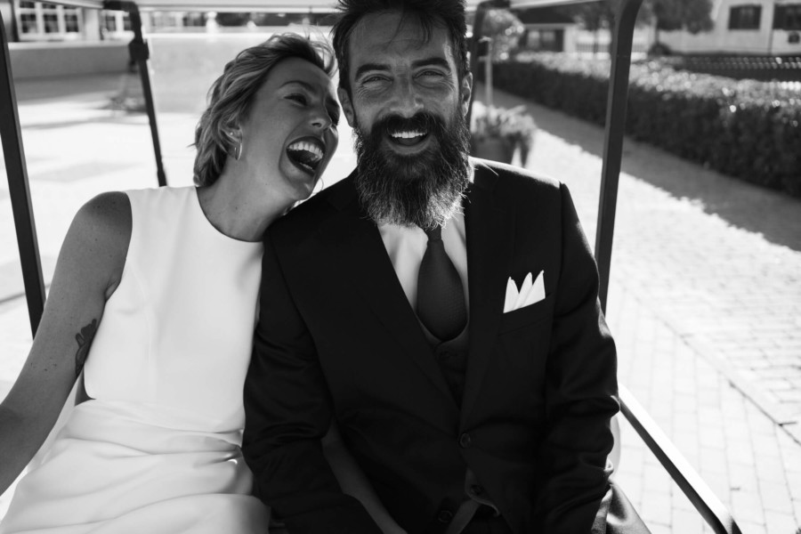 Perros, ukelele, moto clásica con sidecar… Todo tremendo. El calor que hacía en Talavera era asfixiante, pero no deslució el bodón que Susana y Diego nos tenían preparado. Ella se vistió acompañada de su familia y amigas en la casa familiar. Diego lo hizo acompañado de sus padres, su hermana y su cuñado. A casa de Susana llegó Diego a los lomos de una BMW clásica para llevarla en sidecar casi hasta el altar. Los retratos los hicimos en un campo de golf, cuando el fuerte sol nos daba descanso. La cena de cóctel se celebró en Palomarejos Golf. Y fiestón hasta la madrugada. Susana llevaba un sencillo vestido cut-out, sandalias blancas y un ramo en tonos beige y rosa. Diego lucía un traje negro con chaleco gris marengo y corbata burdeos.